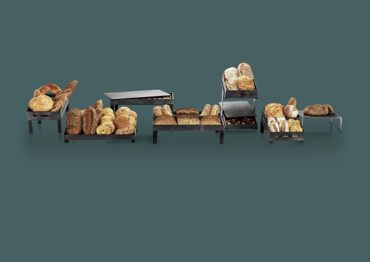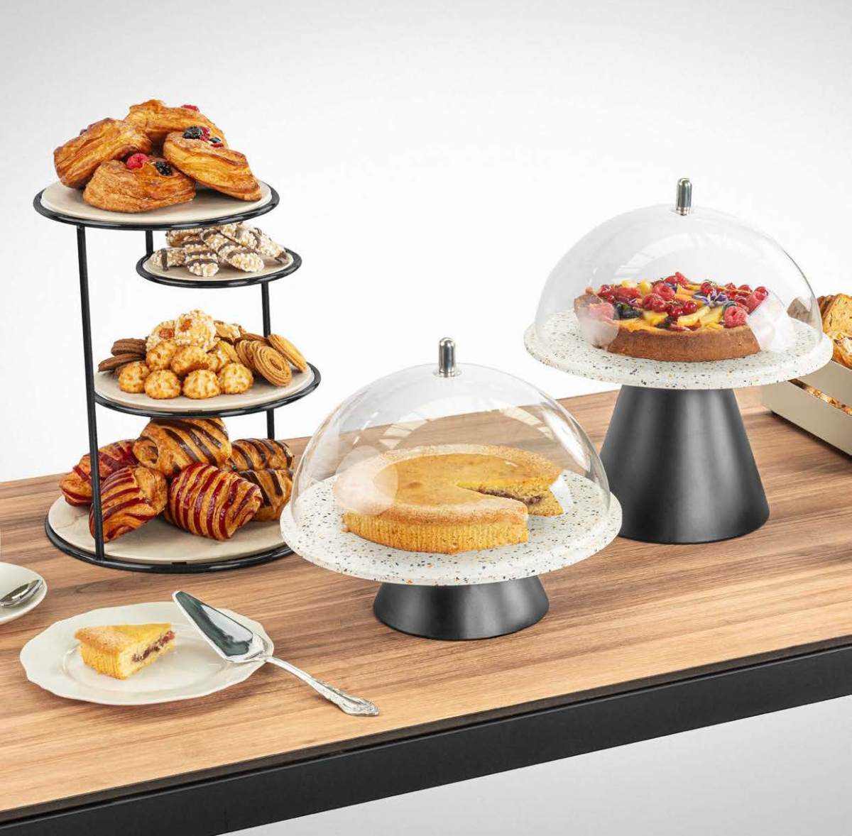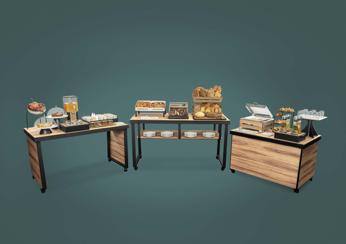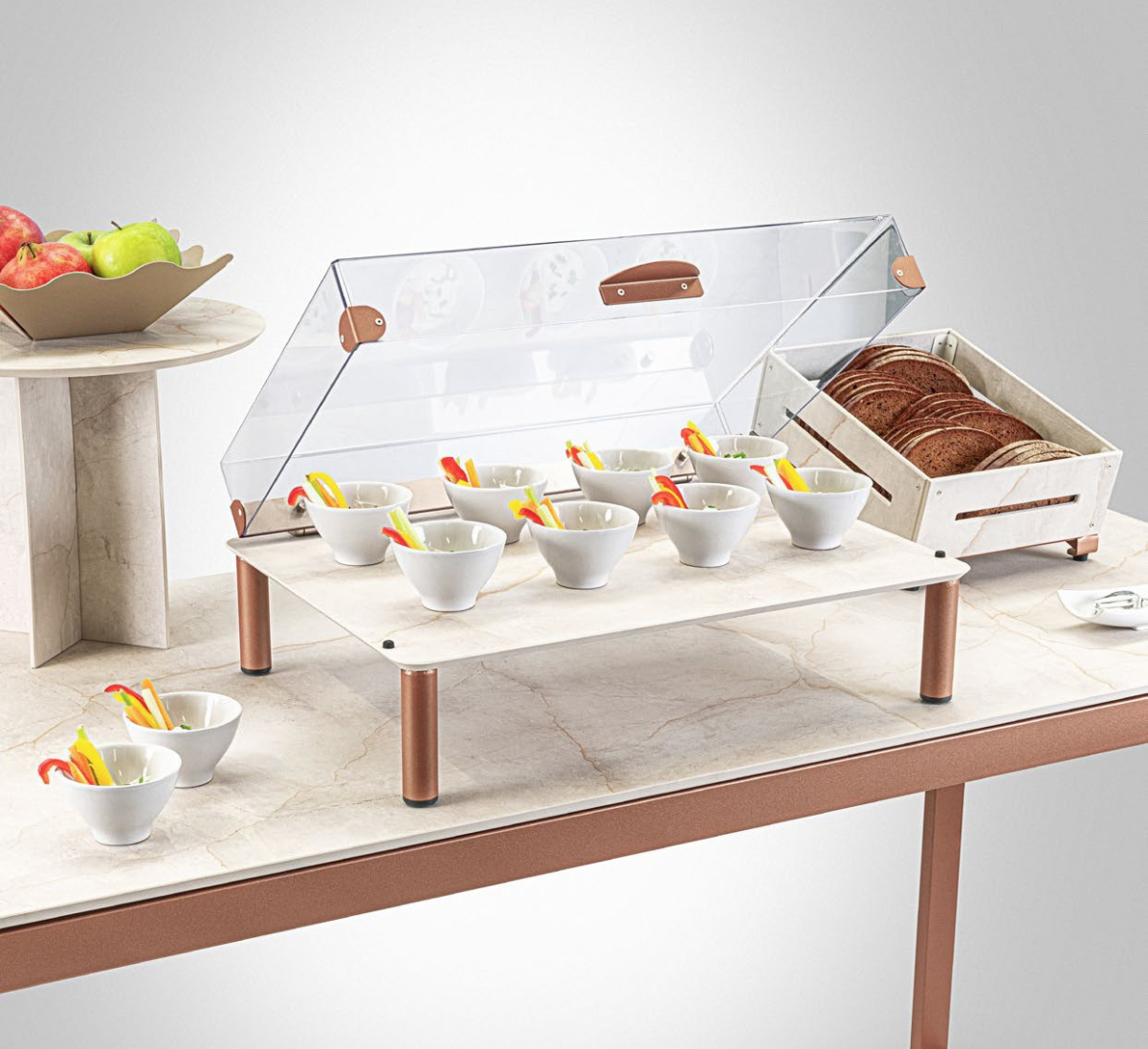 Lo spazio è un fattore critico: soluzioni innovative come vassoi impilabili e rialzi sovrapponibili, tavoli da buffet pieghevoli ed espositori compatti a più livelli aiutano a massimizzare lo spazio disponibile senza rinunciare all’eleganza.